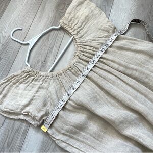 Zara Linen Cottagecore Midi Dress in the color Beige. Elasticized scoop neckline (or can be worn off the shoulder) with short flutter sleeves. Flowy, breathable, semi-sheer woven fabric. Longer back hem than front. Size small, womens. In great pre-worn condition, no major issues. 100% linen. Super cute cottagecore, peasant, bohemian, natural fibers, classic, coastal, retro style.