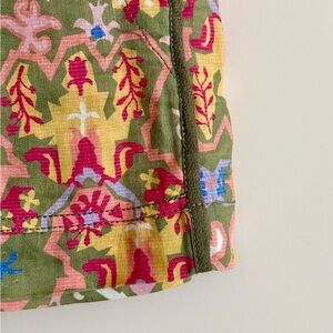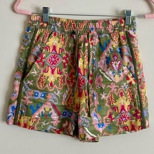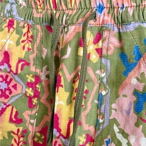 Zara linen shorts in a bold multicolored pattern with shades of green, pink, blue, and yellow. Made from lightweight linen, these shorts feature an elastic waist with drawstring, side pockets, and back patch pockets.
