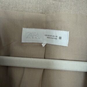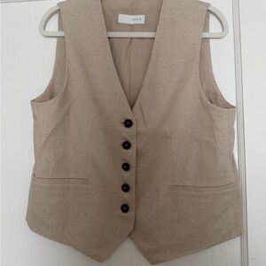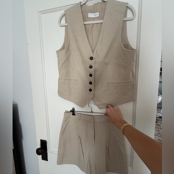 Sleeveless tailored vest with button front. Coordinating high-waist trousers with pleats. Neutral beige for versatile styling. Clean lines and minimal detailing.