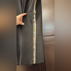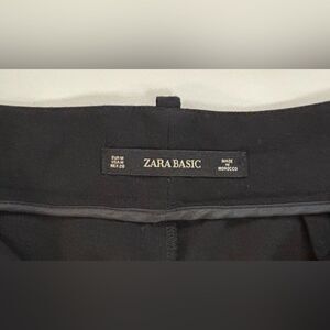 Zara basic logo tuxedo crops. They have pockets in the front and back and the Zara logo down the sides in gold and black lettering. These pants are a size medium and an excellent preowned condition. They are solid black with gold white and a little strip of blue on the trim with the logo. Measurements are in the pictures and below.
