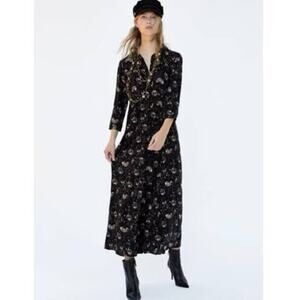 Zara Long Black Floral Dandelion Print Shirt Collared Button Down Maxi Dress
