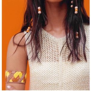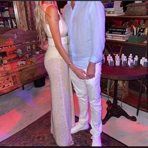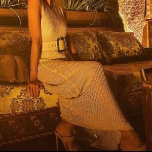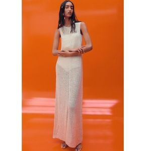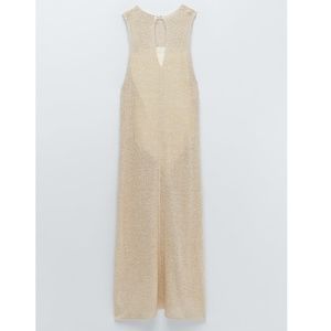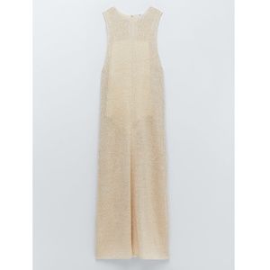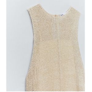 Sleeveless open knit dress with round neckline. Metallic thread detail.