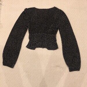 EUC Zara Black and While Polka Dot Long Sleeve Blouse with Cinch waist and tie accent. This is a lightweight cropped garment perfect for an evening out with friends or back to school.