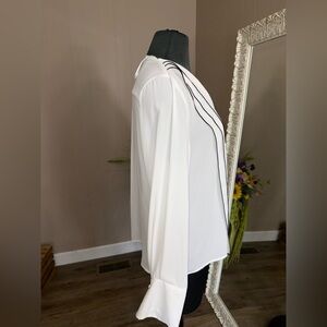 In like new condition. No flaws or blemishes. Semi sheer. Button front. Very slinky and soft. Wide cuffed wrist. Size large.