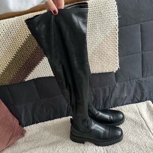 Black over-the-knee boots with a chunky lug sole. Overall in good condition, all flaws are shown in the photos (light creasing and scuffing). Inner side zip closure. AIR FIT TECHNICAL FLEXIBLE LATEX FOAM INSOLE DESIGNED TO OFFER INCREASED COMFORT. SOLE HEIGHT: 1.3 inches UPPER: 100% polyurethane LINING: 80% polyester, 20% polyurethane SOLE: 100% thermoplastic rubber INSOLE: 100% polyester