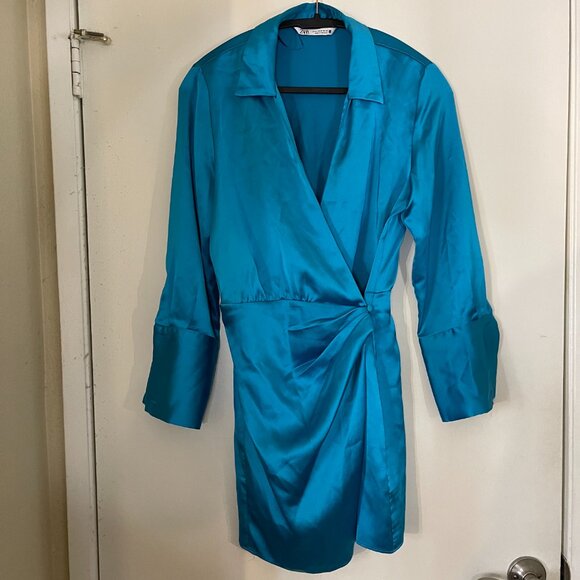 Zara medium blue silk wrap dress with long sleeves—designed to flatter, elegant drape—but missing one cuff button and third front closure button (otherwise excellent condition). Match with sandals or heels, perfect for events or date nights.