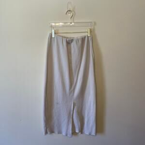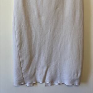 Details: high rise fitted midi skirt Kim Kardashian vibes contemporary minimalist Corpcore business casual beach vacation travel basic layering piece neutral rear vent stretchy elastic waistband Zara Medium