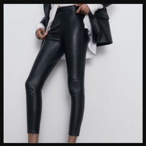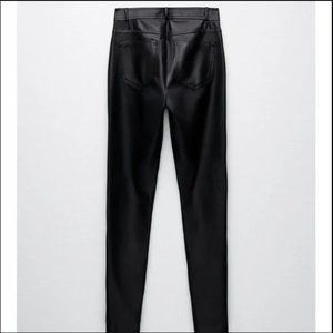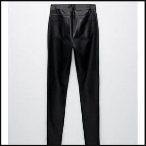 In like new condition, one pair of Zara Made in Turkey High Rise Ankle Zippers Black Faux Leather Slim Jeans in womens S. The cover shot is a photo of similar style but not the same pants.
