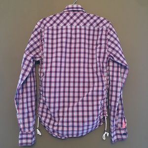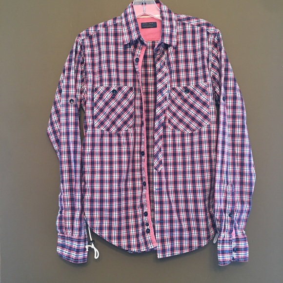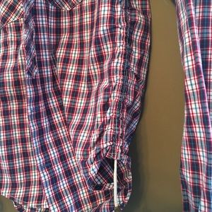 Plaid button down shirt with chest pocket. Long sleeves , drawstrings on both sides. Size small young.