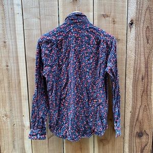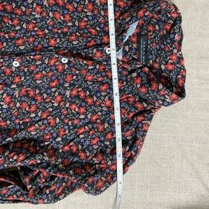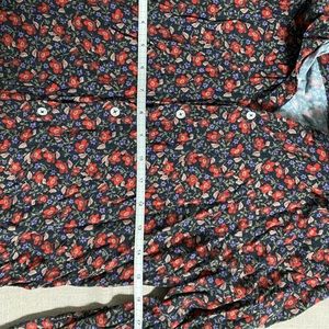 Floral print blouse with gathering at front, back and sleeves. One pockets at front and curved hemline.