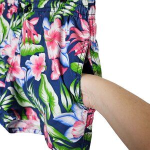 These Zara swim trunks offer a vibrant tropical floral design on a navy background, combining style with functionality. The mesh lining ensures comfort, while the adjustable tie provides a secure fit. Ideal for resort wear or casual poolside relaxation.