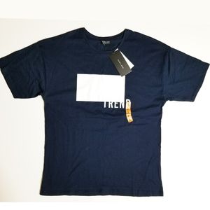 Deep blue shirt, with vinyl white square and raised felt letters "TREND"