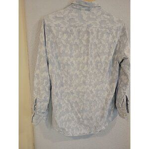 The Zara Man Shirt in Adult Medium size is a stylish blue-gray button-up shirt designed for men. It features a slim fit, collared neckline, long sleeves, and a spread collar style. The gray color with a camouflage pattern adds a trendy touch to this casual button-down shirt, making it perfect for various occasions. Made in Portugal, this shirt is machine washable and suitable for all seasons, making it a versatile and fashionable addition to any man's wardrobe.