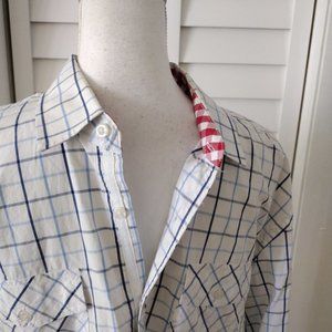 Zara Man Tailor Fit button-front shirt. Blue plaid with contrasting red & white check cuffs and inside collar. Mint condition with no defects.