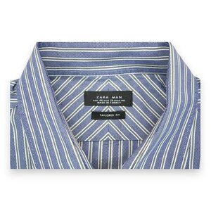 Elevate your style with this Zara Man tailored fit button-up shirt. Featuring a timeless blue and white striped pattern, this shirt is perfect for any casual occasion. Made with lightweight cotton material, this shirt is comfortable to wear in any season and easy to care for with machine washing.