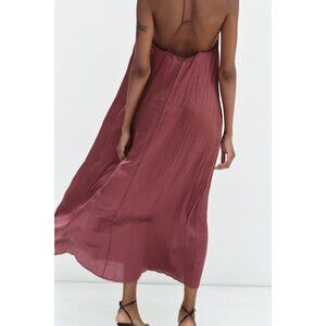 Embrace elegance with this Zara slip dress in a rich marsala hue. Its satin effect and flowing silhouette exude sophistication, making it a standout choice. The cross-back and twist detail straps offer a unique touch, while the V-neckline flatters the figure. Crafted from 100% polyester, it promises comfort and style.