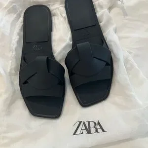 Sleek Zara slides with woven crossover straps. Square toe and flat sole. Easy slip-on wear for everyday use. 38/8.5