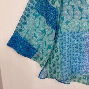 Zara Medium Blue Patchwork Boho Print Flare Sleeve Relaxed Button Up Festival