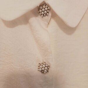 Zara Medium Cream Tie Neck Blouse W/ Decorative Buttons of Clustered Pearl Beads