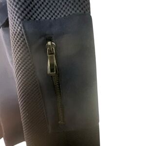 With front pockets in a suede like material and a zip pocket in the same material on one sleeve, wide cuffs on sleeves and with wide broader hem, 100% cotton long sleeves. Nwot