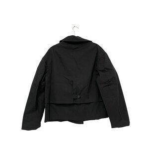 Short technical trench coat made from a lightweight fabric. Notched lapel collar and long sleeves.