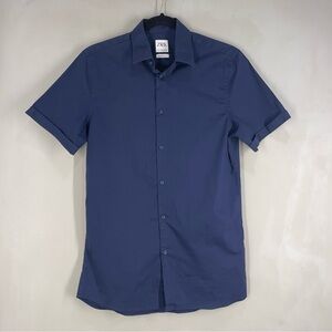 Zara Mens Large Super Slim Fit Navy Blue Short Sleeve Button Front Shirt Medium