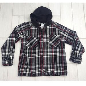 Zara Mens Medium Plaid Overshirt Shacket Button Up Hooded Jacket Black Red Shirt
