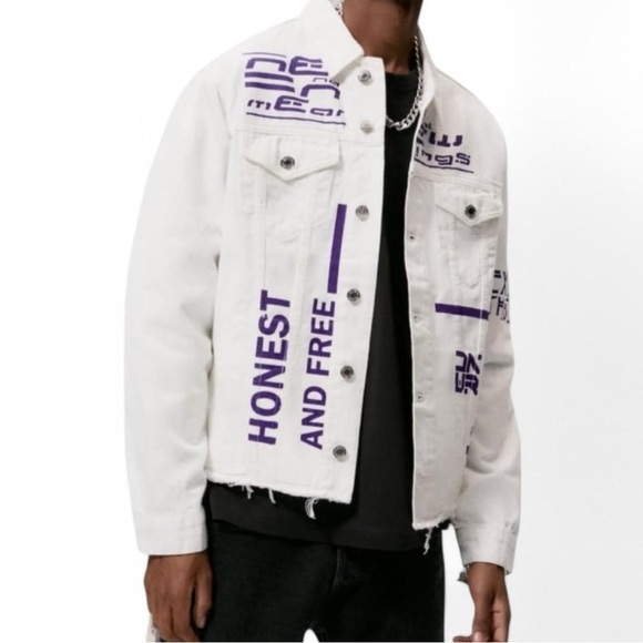 Stand out in style with this Zara men’s white denim jacket! Featuring bold purple writing like “Honest & Free,” “Feel, Vibe, Feel,” and “For the Love of Authenticity,” it’s the perfect urban statement piece. With frayed hems and a great fit, this medium jacket adds a fun, rebellious vibe to any outfit. Don’t miss out on this unique and trendy jacket!