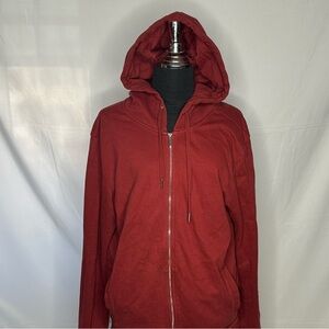 Bold red zip-up sweater by Zara. Features a comfortable hood and sleek design. Ideal for layering.