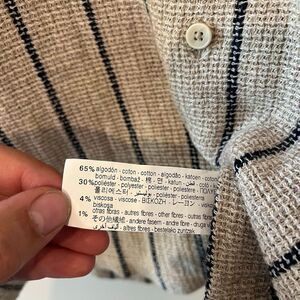 This stylish Zara knit shirt is a perfect blend of comfort and casual sophistication. Crafted from a breathable, textured knit fabric, it features a timeless tan/beige base interwoven with striking black vertical pinstripes, creating a rich, dimensional look.
