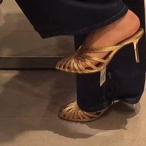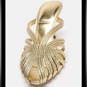 Metallic effect mule sandals. Multiple straps at the front. High stiletto heel. Pointed toe.