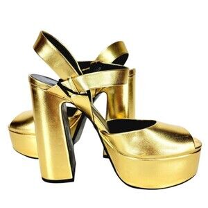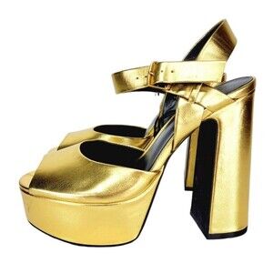 keywords: metallic, strappy, platform, Vintage, ultra-high heel, chunky heel, ankle strap, open toe, peep toe, gold, disco, 70s, 90s, clubwear, going out, fun, festival, party, cocktails, trendy, rare, hard to find, contemporary, 60s,