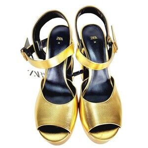 Zara Metallic Gold Open Toe Chunky Heel Ankle Strap Platforms Size 39 EUR 8 US