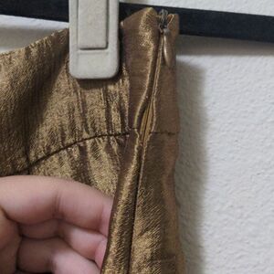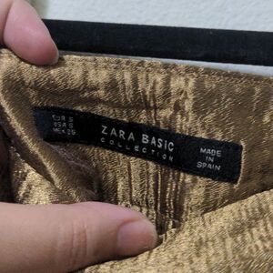 This preloved Zara Metallic Gold Pleated Trouser Pant is a fun and funky statement item to add to your wardrobe. The pant has a high waist, side zipper, no front pockets but two faux pockets on the back