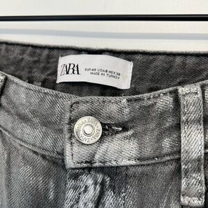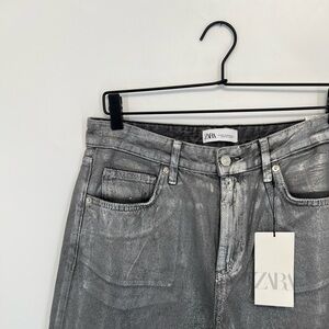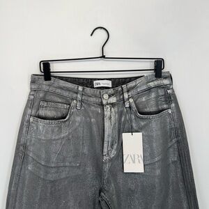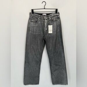 Zara Metallic Gray Mid Rise Slouchy Wide Straight Long Leg Jeans