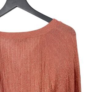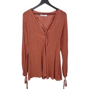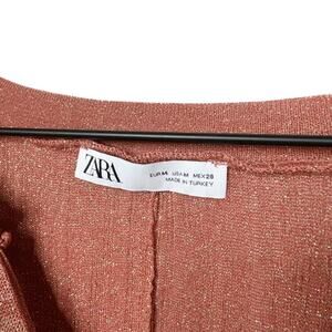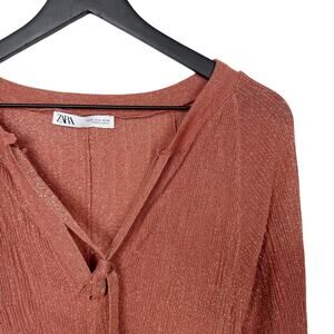 Zara Metallic Long Sleeve Tie Front Top, Size Medium. This shimmering copper top features a tie-front closure and long sleeves, adding a touch of sparkle to your wardrobe.
