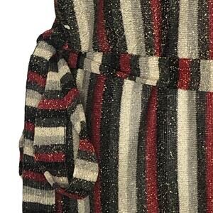 Add a touch of shimmer to your wardrobe with this Zara metallic striped belted midi dress, featuring a flattering V-neck and a self-tie belt for a tailored, feminine silhouette. The cream, tan, brown, black, grey, and red stripes are enhanced with subtle metallic threads that catch the light beautifully, making this dress perfect for everyday wear, dinner dates, concerts, or festivals.