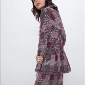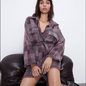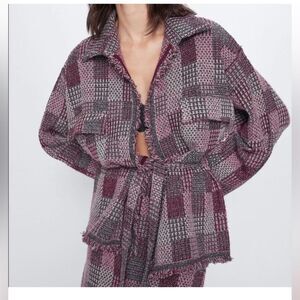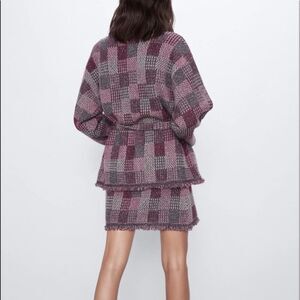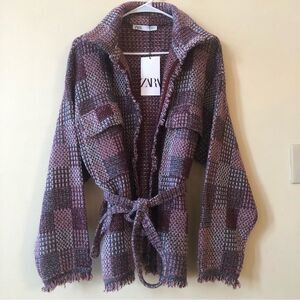 Zara Metallic Tweed Check Knit Belted Oversized Cardigan