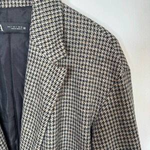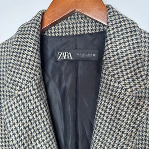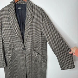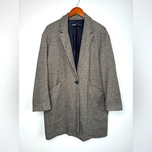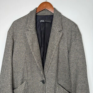 Zara Micro Check Cotton Blend Houndstooth One Button Longline Car Coat Blazer