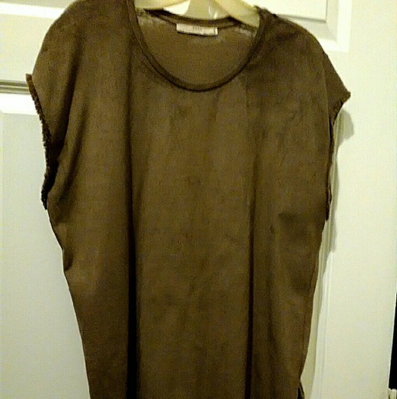 A badass alternative to your everyday Tee! Features a buttery soft microsuede front and tee shirt back, frayed sleeve holes and side slits. Zara size 30 - it's very roomy on me and I usually wear a L - XL. Very gently used.
