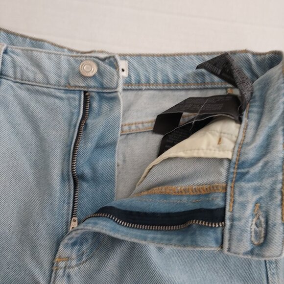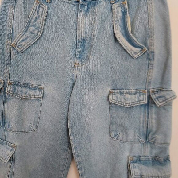 Size 6 Zara Mid-Rise Multiple Pockets Baggy Jeans. 68% cotton 32% lyocell. Front zip and button closure. Front pockets and back patch pockets. Patch multi-pockets with flaps at leg. One small flaw. Snap closure missing on flap pocket. Please see last photo. Very good pre-owned condition.