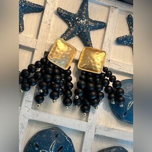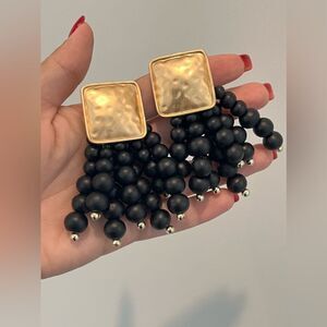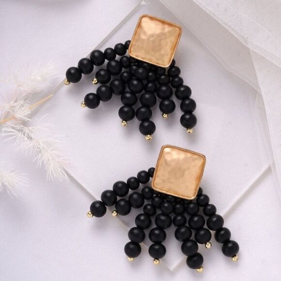 These earrings are a bold and elegant statement piece, featuring a combination of gold-toned hammered square studs and cascading black beads. The design exudes a modern and sophisticated aesthetic with a touch of drama, making them perfect for both formal occasions and adding a luxurious touch to everyday outfits. The contrast between the matte black beads and the glossy gold accents creates a striking visual effect, while the cascading bead design adds movement and a dynamic element to the overall look.