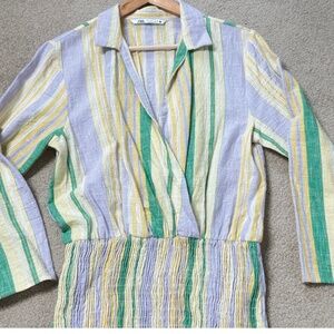 Zara Mini Dress Shirred Skirt Pastel Stripe Long Sleeve Cotton Mini Dress Size Large