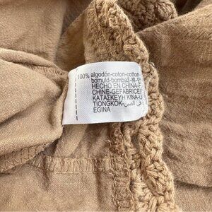 Mixed macrame dress by Zara. Earth brown color. Crochet knit top and trim with breezy cotton skirt. 100% cotton. Round neck. Short sleeves. Unlined. Midi length. Some minor wear on fabric, but in overall excellent condition!