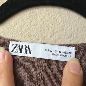 Effortlessly elegant, this sleeveless Zara knit dress features a deep V-neckline and a sleek, column silhouette that skims the body. Done in a rich mocha brown, it's the perfect minimalist statement for summer-to-fall layering. Size Small – 17” pit to pit; 53” length.