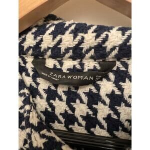 Zara Mock Neck Houndstooth Fringe Hem Pullover Sweater Size Small Cream Navy