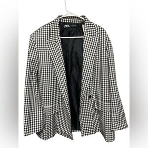 Stylish checkered blazer by Zara. Features a classic black and white pattern. Ideal for versatile wear.