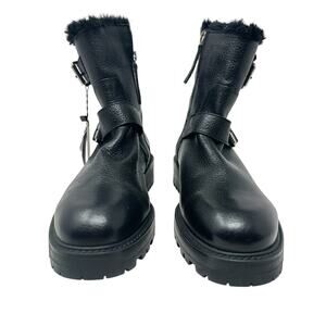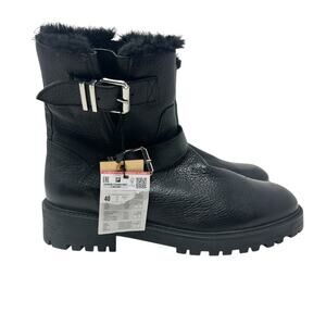 Zara Moto Ankle Boots Leather Buckle Shearling Lined Black Size 40 US 9