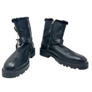 Black leather moto boots with silver hardware buckles. Shearling lining. Side Zips.