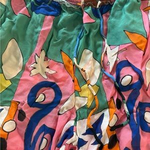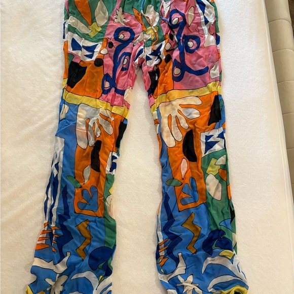 Bold Zara pants with a striking abstract design. Features a mix of vibrant colors for a standout look. With a drawstring and 2 back pockets. Sheer and great as a beach cover up.